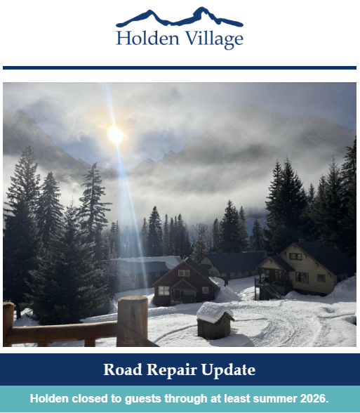 CHELAN, WA. January 23, 2026 - Over the past few weeks we have been working closely with our partners at the US Forest Service (USFS), Chelan County, and others to ensure repairs to Forest Service Road (FSR) 8301 and the reopening of Holden Village to guests and staff happen as soon as possible. USFS is leading this process. They are doing everything they can to put this on the fastest possible path, and we will continue to advocate wherever possible for Holden’s quickest, fullest recovery. However, the repair process will be long and contingent on many variables that are out of our control.